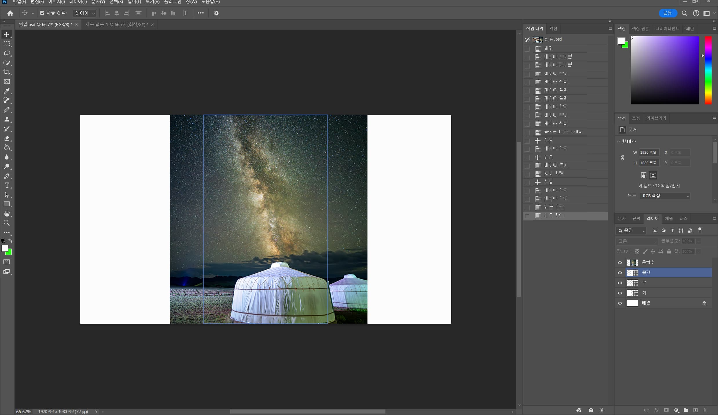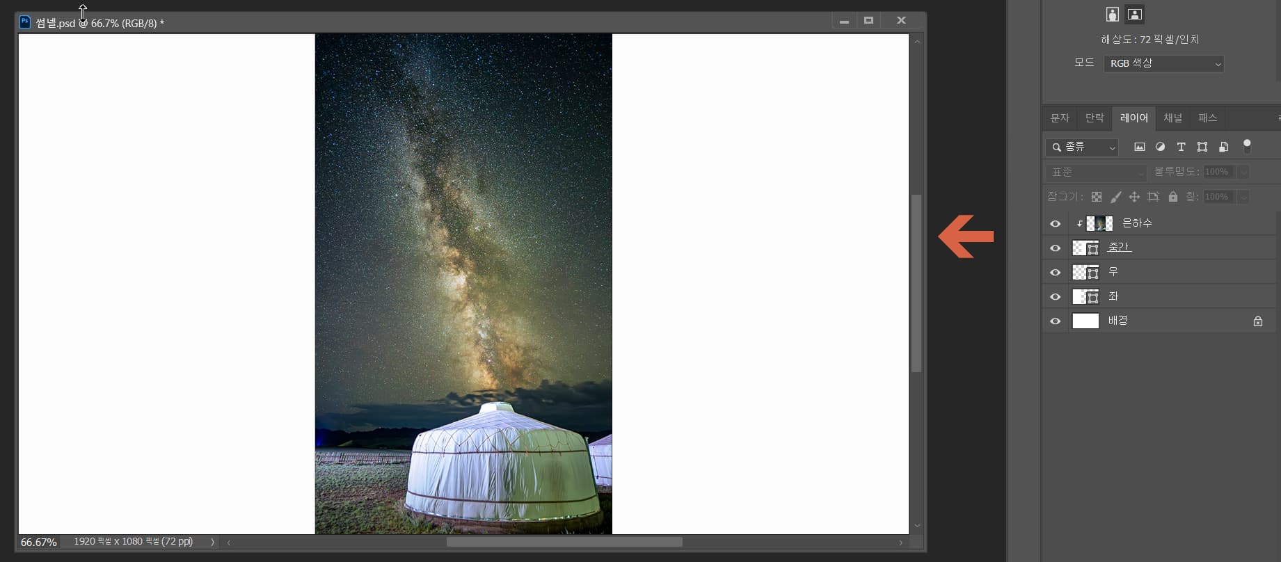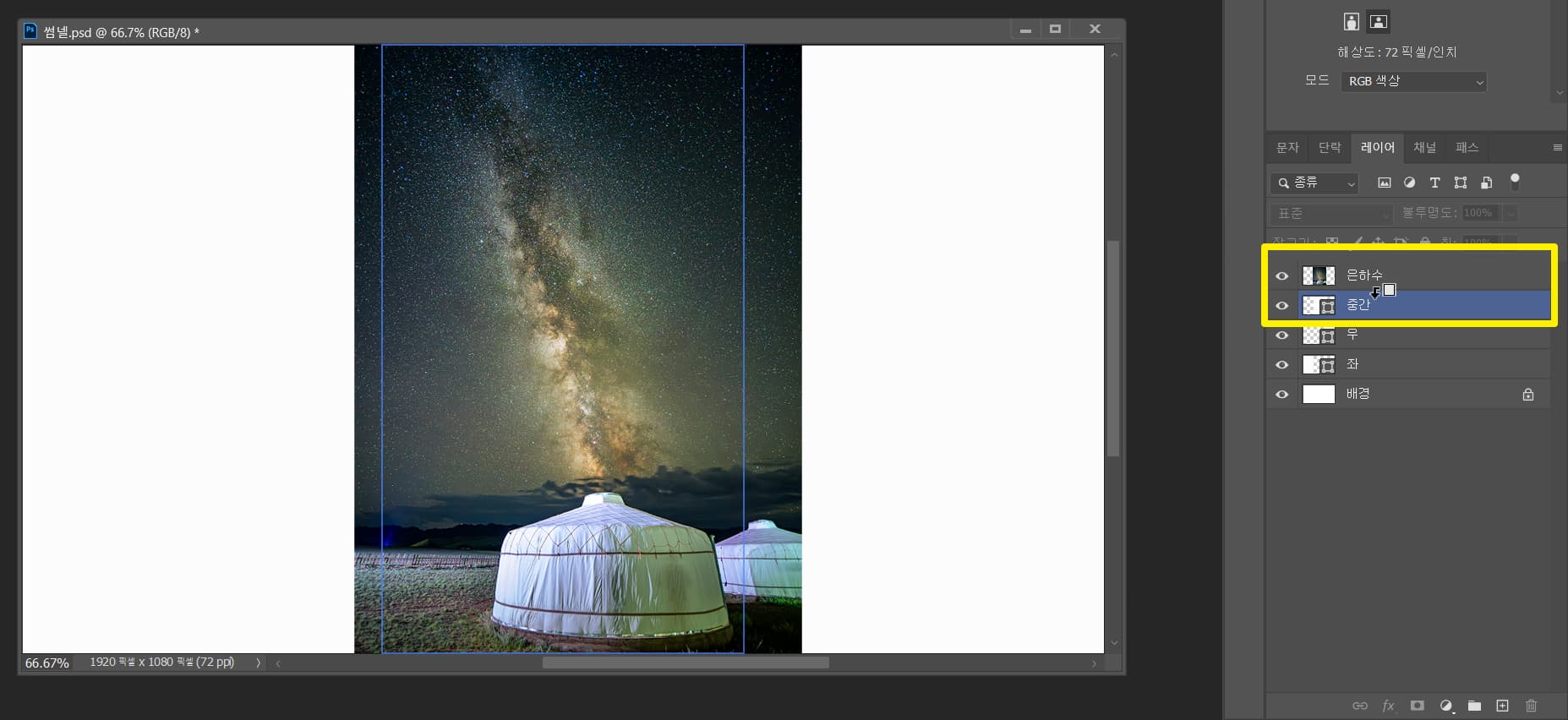 나는 이번 영상의 썸네일을 활동/동행들과의 추억/풍경(은하수) 크게 세분할로 나누고 싶었다.