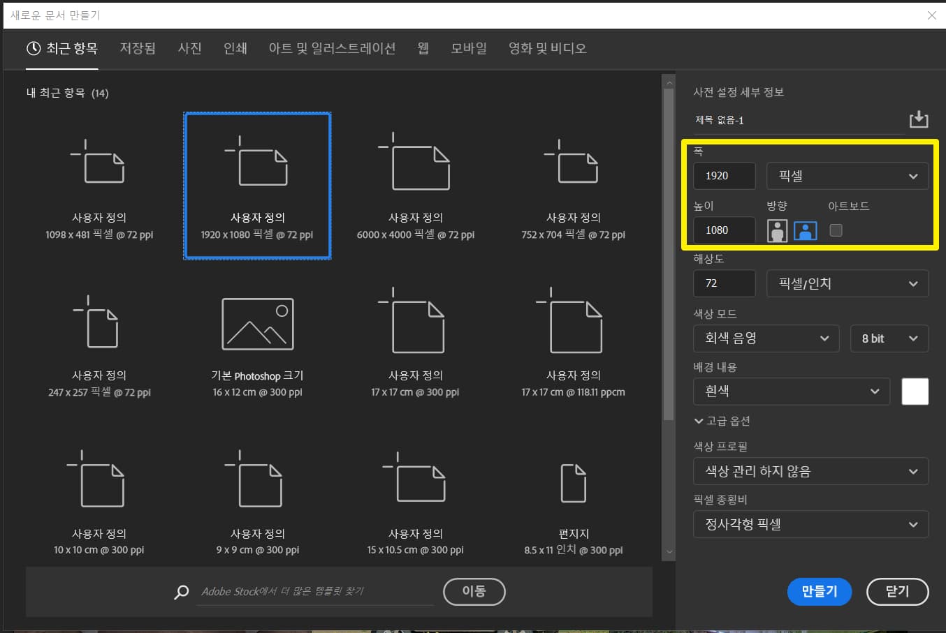 유튜브에 업로드하는 썸네일의 경우 16:9 비율로 포토샵으로 작업할 때는 1280*720 또는 1920*1080픽셀을 설정해준다.