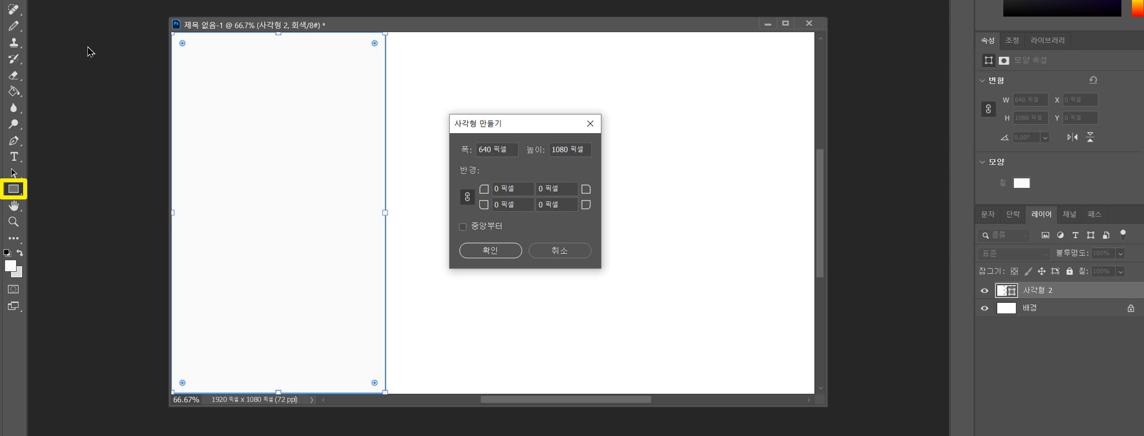 1. 사각형툴 선택 > 사각형을 클릭 후 폭,높이 조정한다.