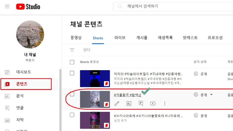 1. 유튜브 스튜디오로 이동 > Shorts 클릭 > Shorts 영상 클릭